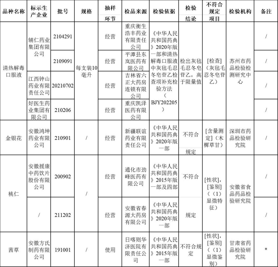 經(jīng)安徽省食品藥品檢驗研究院檢驗,標示為安徽援康中藥飲片股份有限公司生產(chǎn)和抽取自安徽省春源大藥房有限公司的2批次桃仁不符合規(guī)定,不符合規(guī)定項目包括性狀、顯微鑒別。